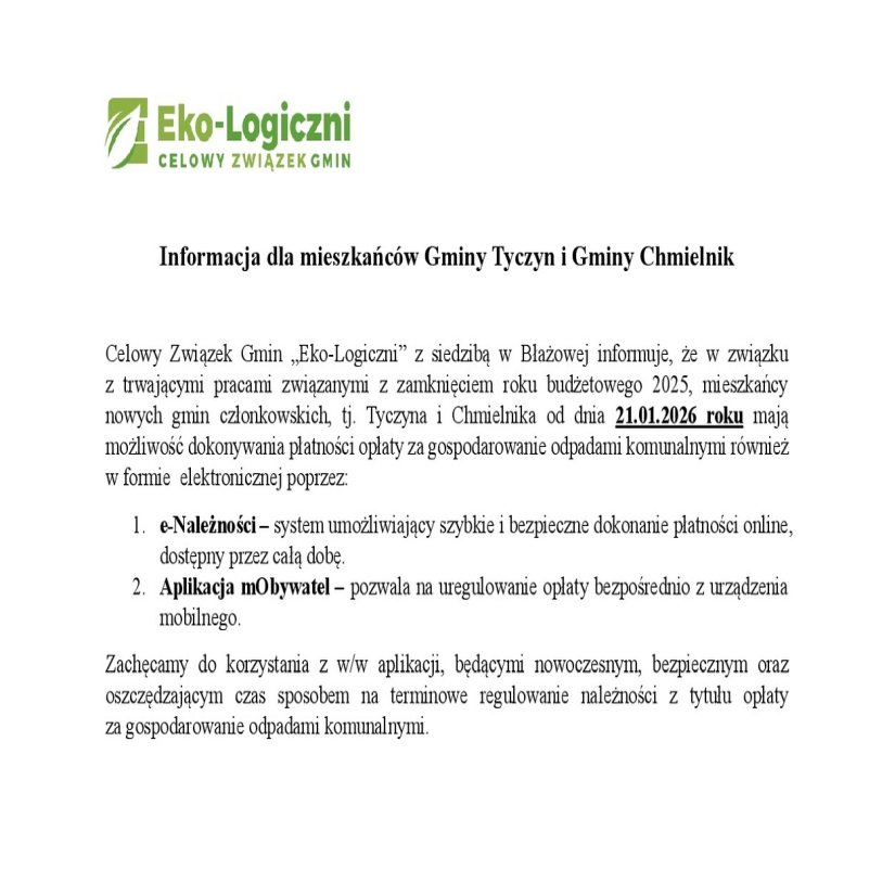 Celowy Związek Gmin ,,Eko-Logiczni’’ utworzony został wspólnymi siłami przez 5 gmin, uczestników Związku w celu prowadzenia wspólnej gospodarki odpadami komunalnymi. Na terenie Związku obowiązywać będą jednolite zasady, tj. jedna stawka opłaty za odbiór i zagospodarowanie odpadów komunalnych od mieszkańców oraz wspólny Regulamin utrzymania czystości i porządku na terenie gmin członkowskich Celowego Związku Gmin ,,Eko- Logiczni’’ w zakresie gospodarowania odpadami komunalnymi.