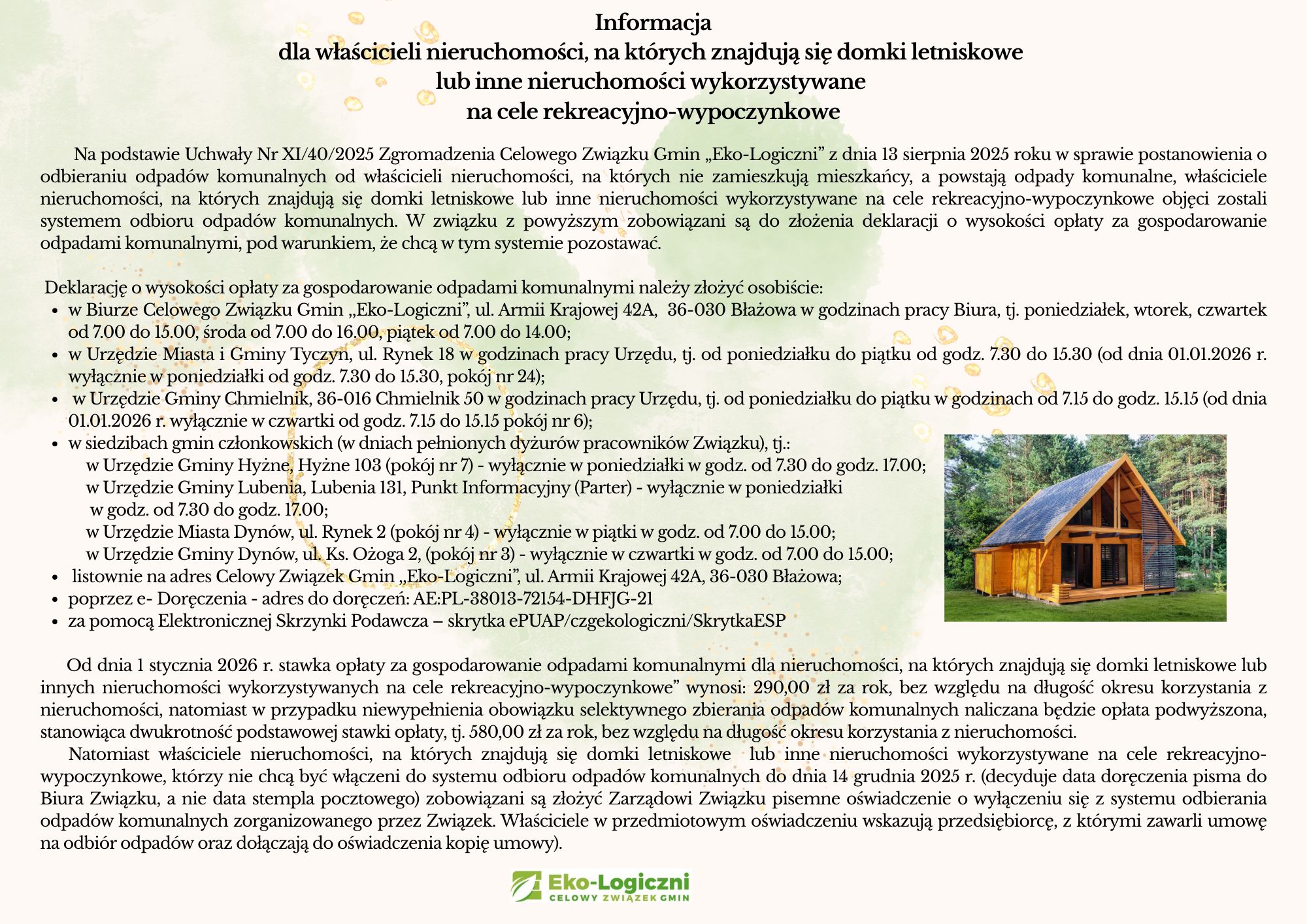Celowy Związek Gmin ,,Eko-Logiczni’’ utworzony został wspólnymi siłami przez 5 gmin, uczestników Związku w celu prowadzenia wspólnej gospodarki odpadami komunalnymi. Na terenie Związku obowiązywać będą jednolite zasady, tj. jedna stawka opłaty za odbiór i zagospodarowanie odpadów komunalnych od mieszkańców oraz wspólny Regulamin utrzymania czystości i porządku na terenie gmin członkowskich Celowego Związku Gmin ,,Eko- Logiczni’’ w zakresie gospodarowania odpadami komunalnymi.